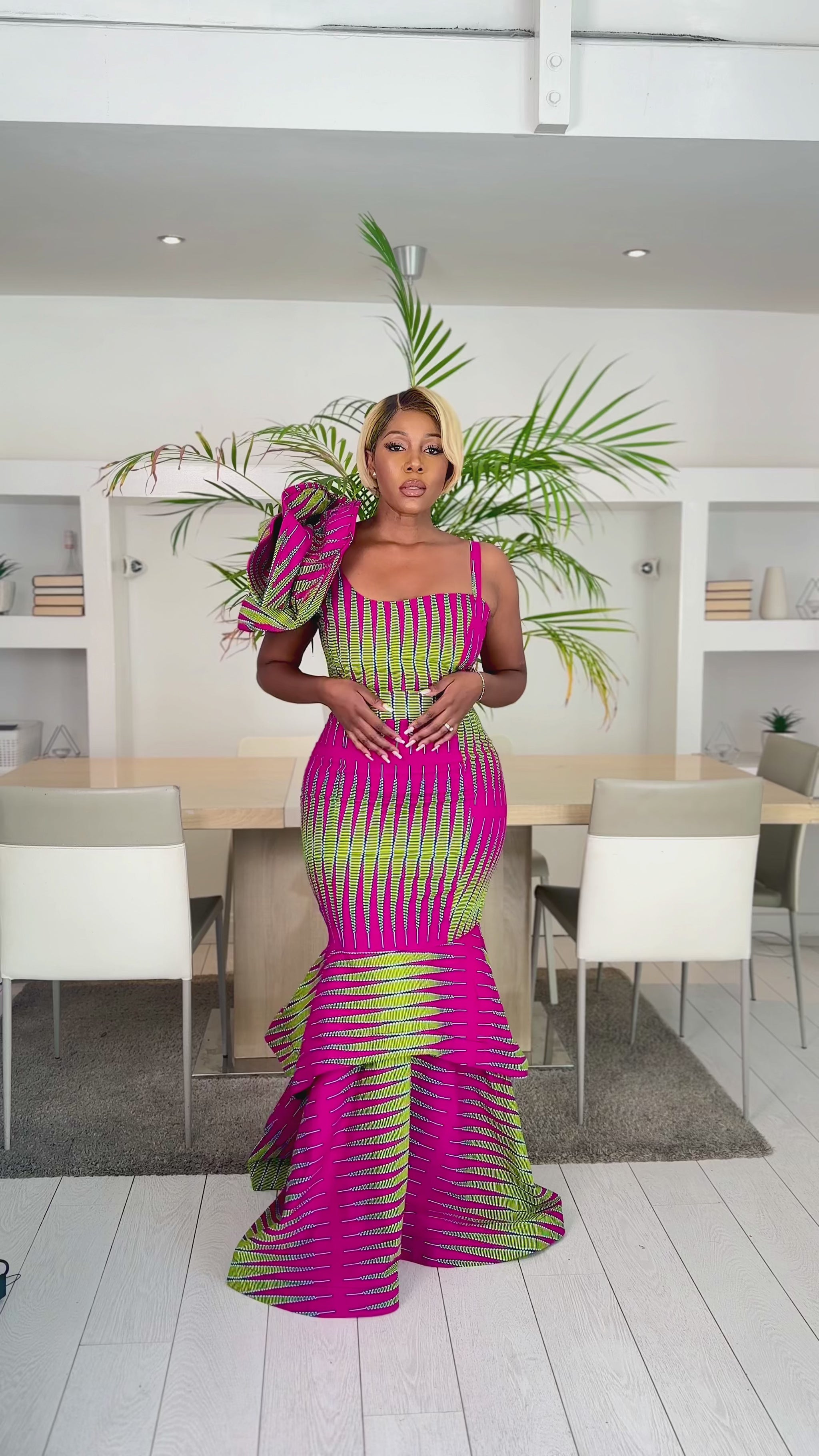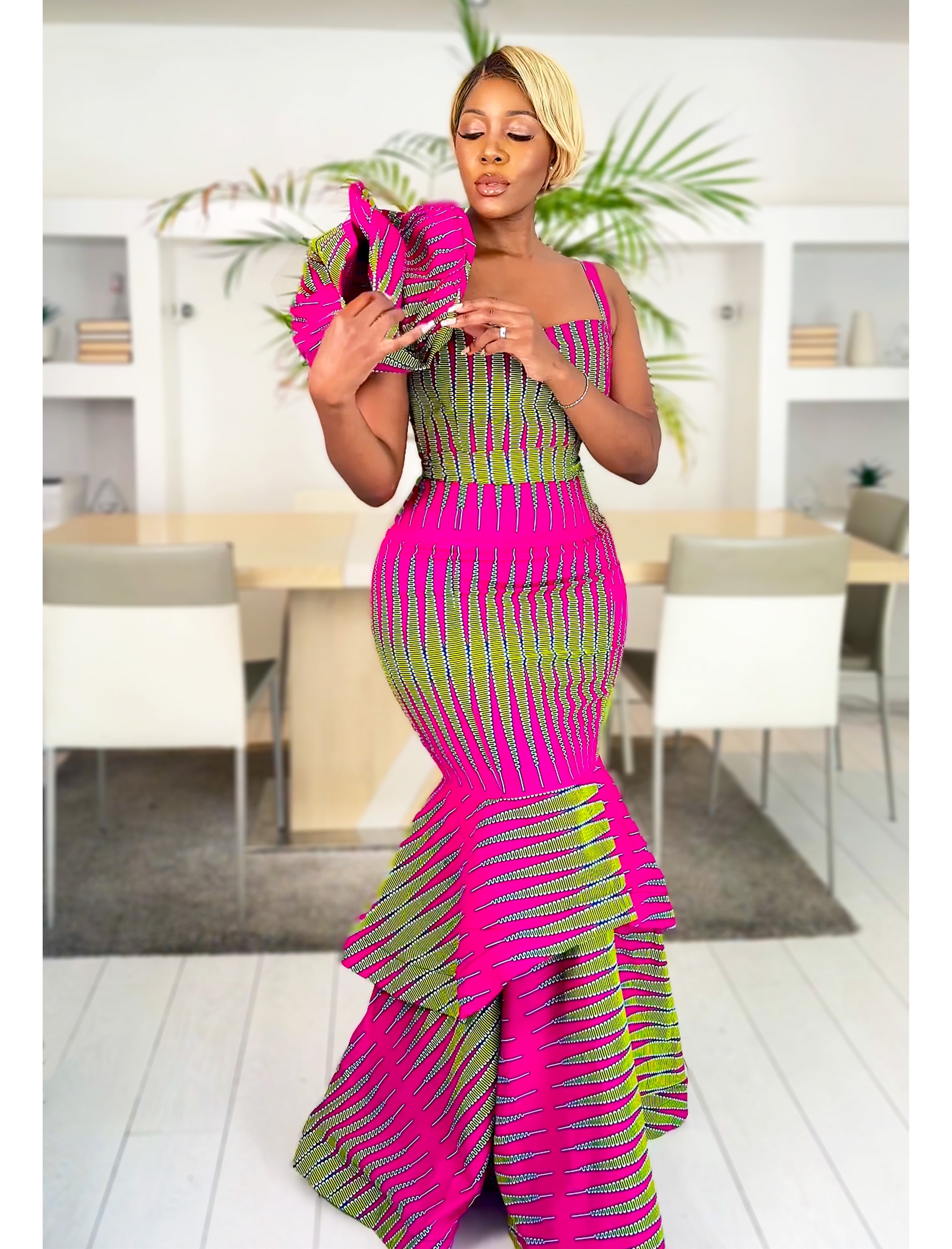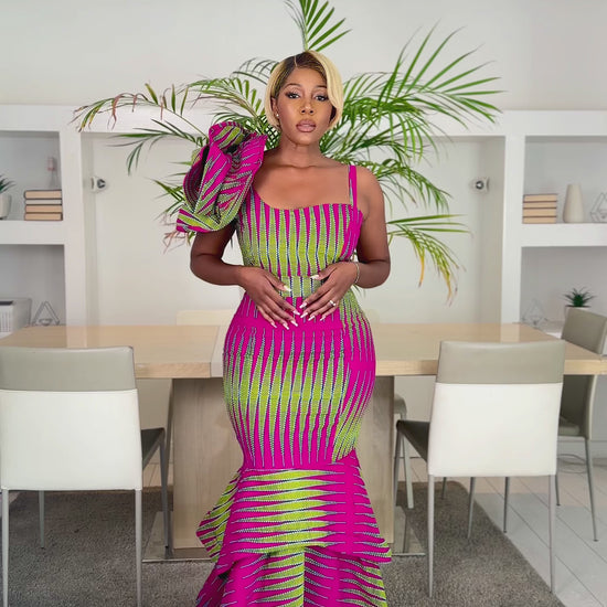 Description: Turn heads in this one-shoulder African print mermaid dress, designed with a dramatic ruffle sleeve and a curve-hugging silhouette that flares into a statement fishtail hem. Perfect for weddings, red carpet events, proms, and special occasions, this Ankara gown blends tradition with modern elegance.