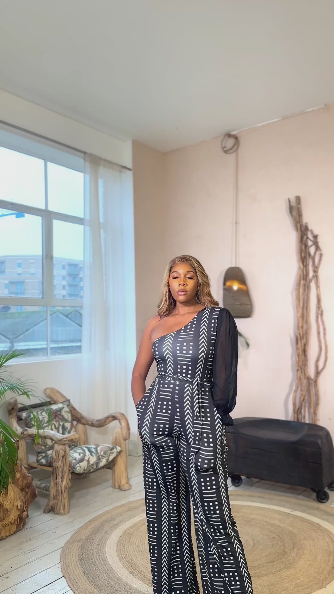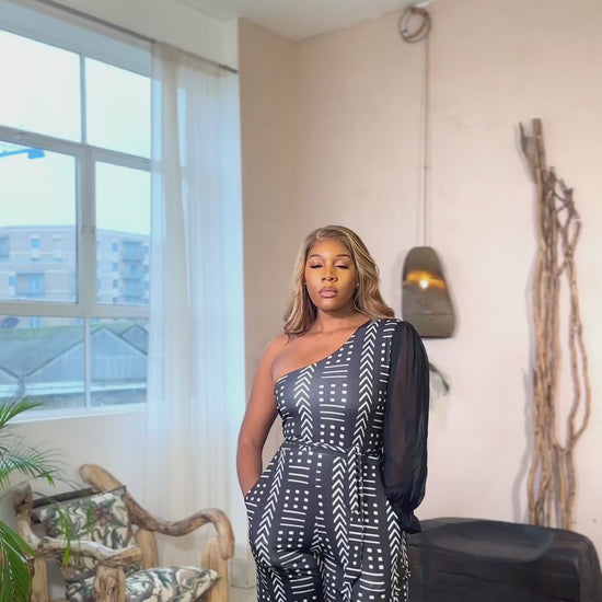 Description: Beautiful Bogolan print jumpsuit with one arm chiffon sleeve. The fabric is stretchy for a more comfortable and better fit, also hugs the figure nicely.