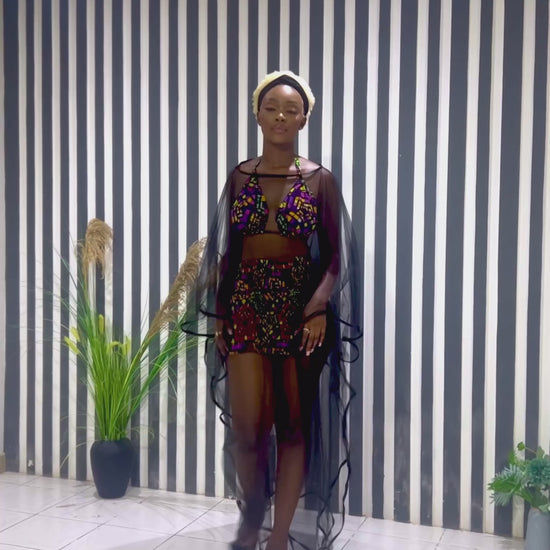 Description: Matching top and mini skirt with sheer Kaftan. Skirt is stretchy for extra comfort.