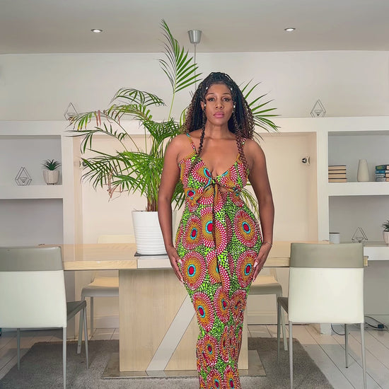 Description: The Aisha set is bold and radiant, designed in a vibrant Ankara fabric. Featuring a tie-front bust, slim straps, and a flattering body-hugging fit, this midi bodycon style is perfect for date night, day parties or evening occasions.